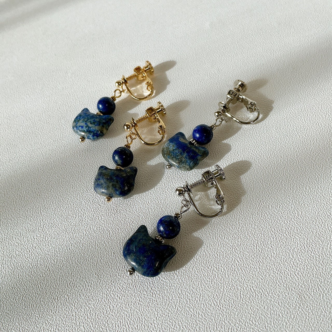 天然石ラピスラズリを使用したネコちゃんイヤリングは、個性的で可愛らしいデザインが特徴です。