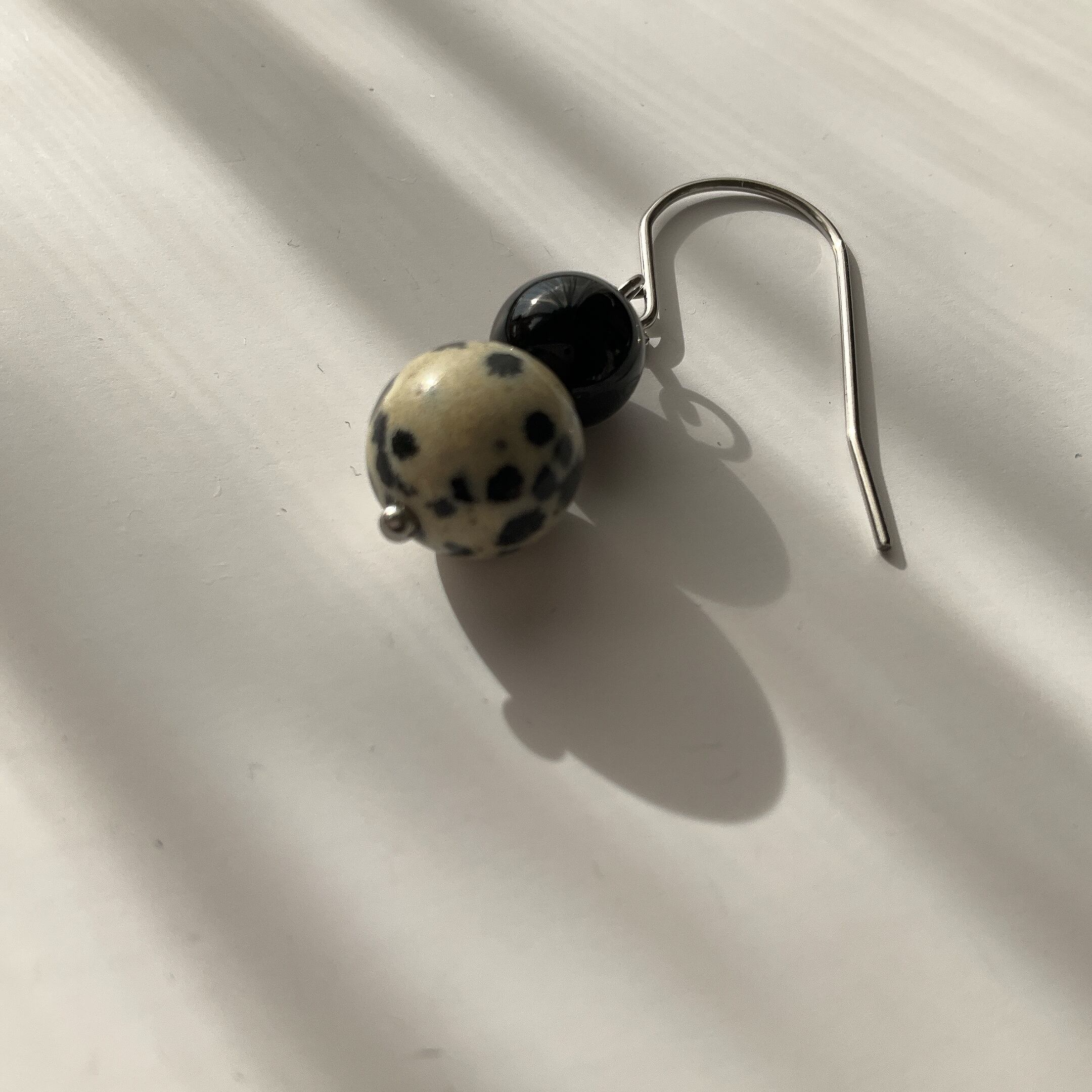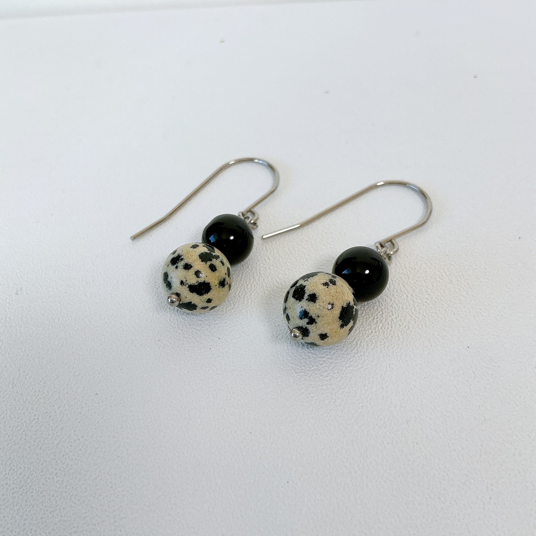独特な模様が魅力のダルメシアンジャスパーと、深い黒色のオニキスを組み合わせたピアスです。