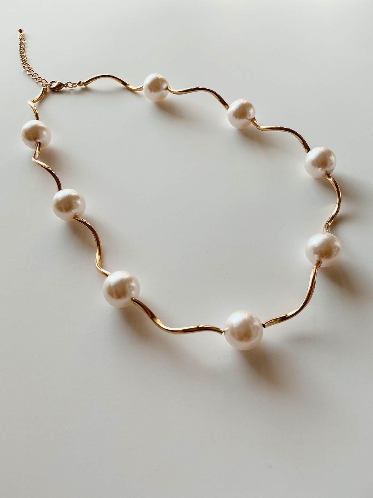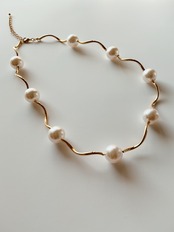 スパイラルパーツとパールのネックレスは、華やかさとエレガンスが融合した素敵なアイテムです。