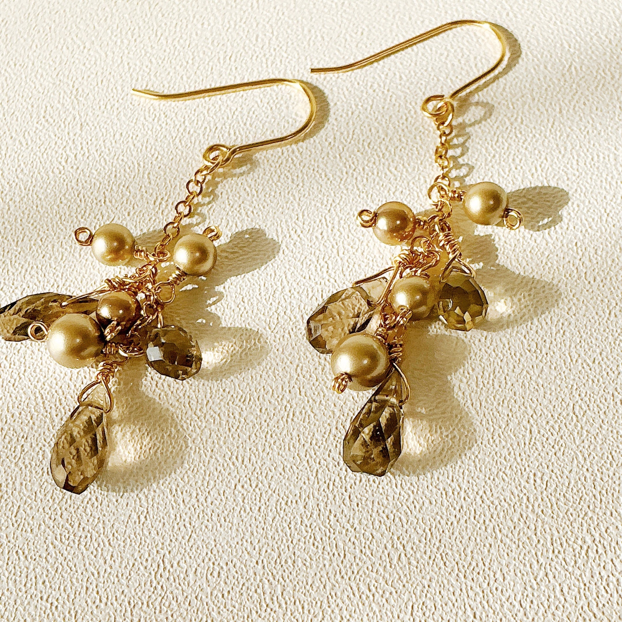スモーキークォーツの自然なトーンとスワロフスキー社製パールの輝きが絶妙に調和し、コーディネートを一層引き立てます。