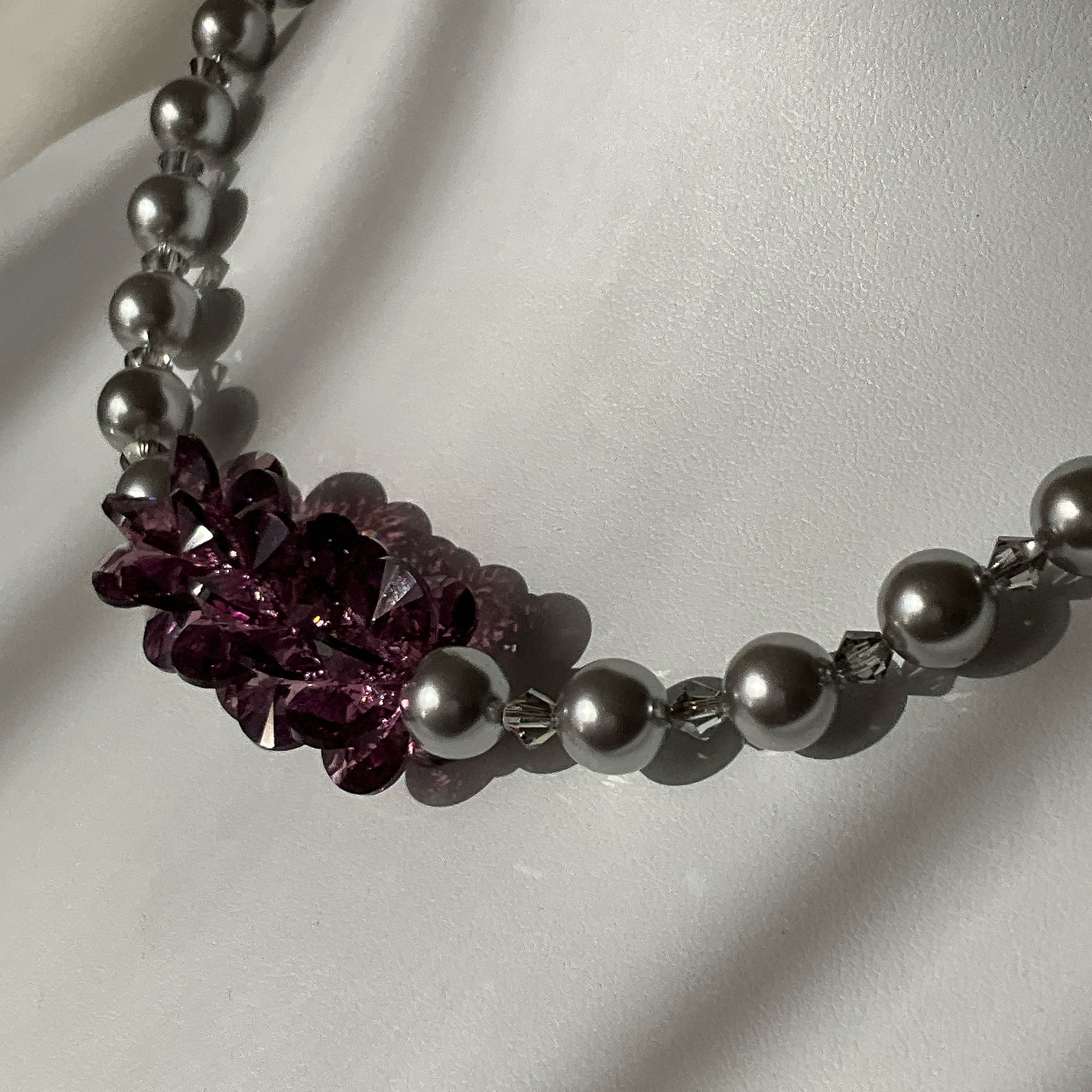 美しいクリスタルビジュとスワロフスキー社製パールが組み合わさったデザインは、身に着けることで持つ人の魅力を引き立て、コーディネートに特別なエレガンスを加えます。